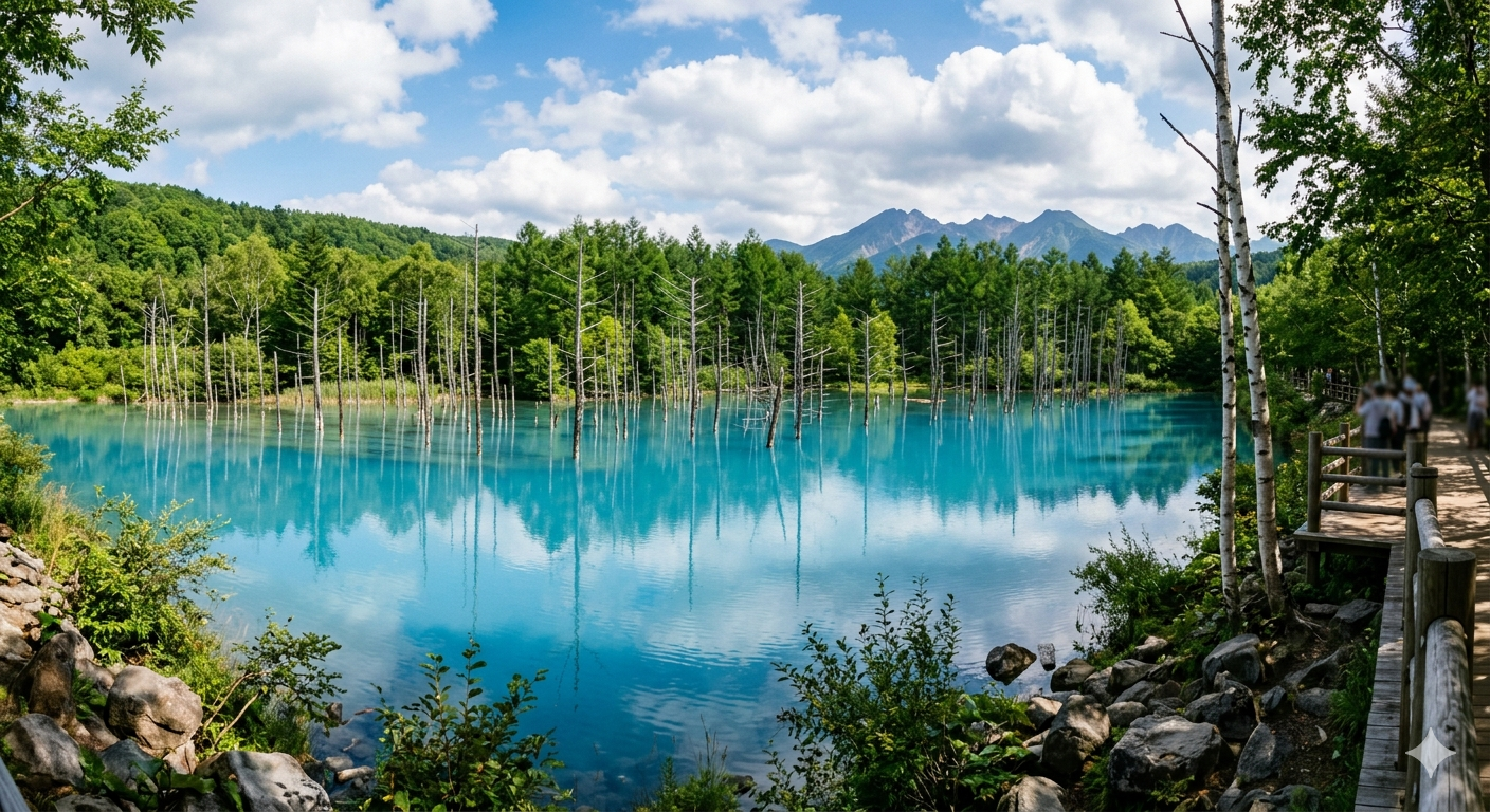 美瑛の深い森の中に、ひっそりと現れるコバルトブルーの水面。